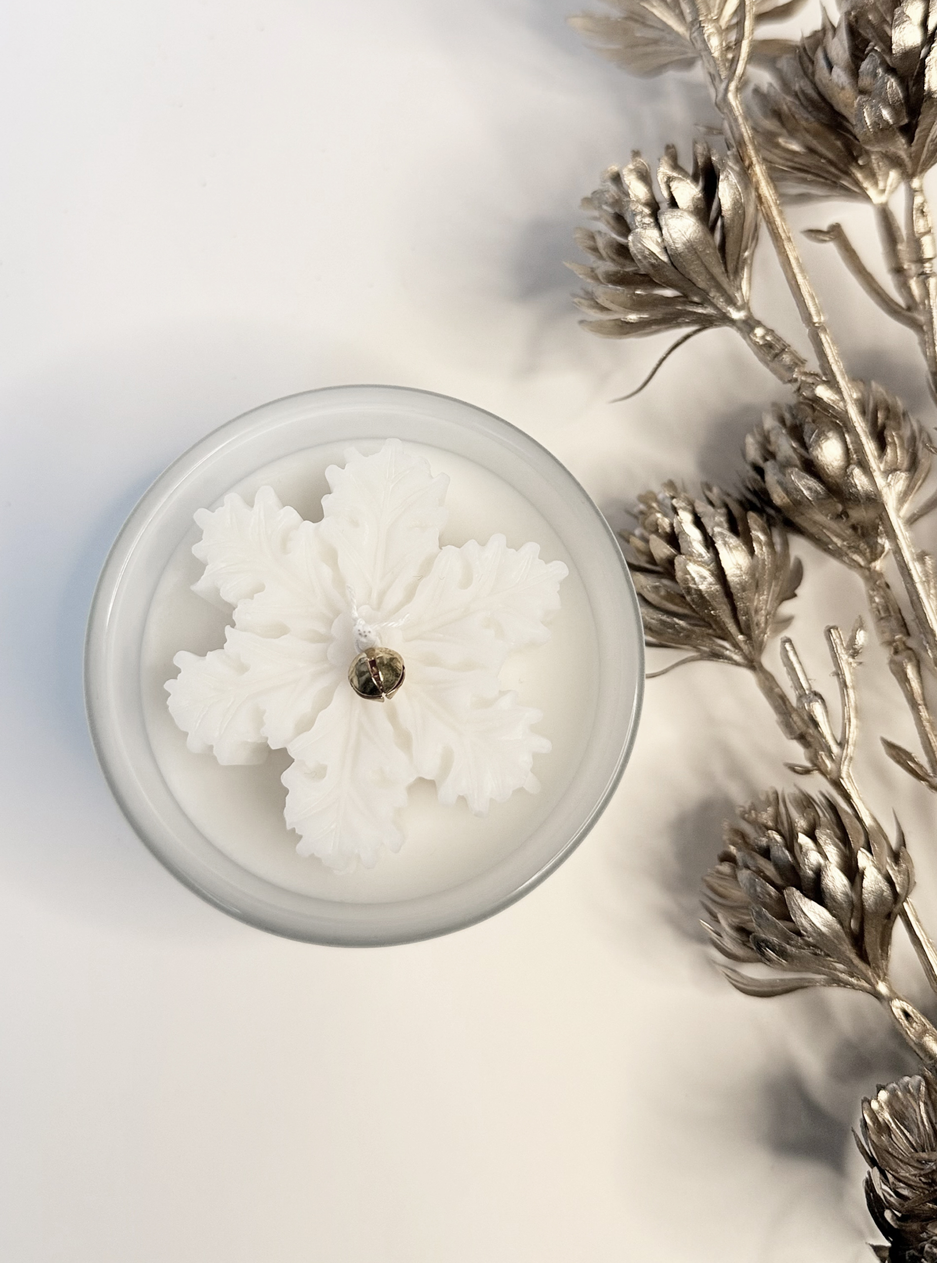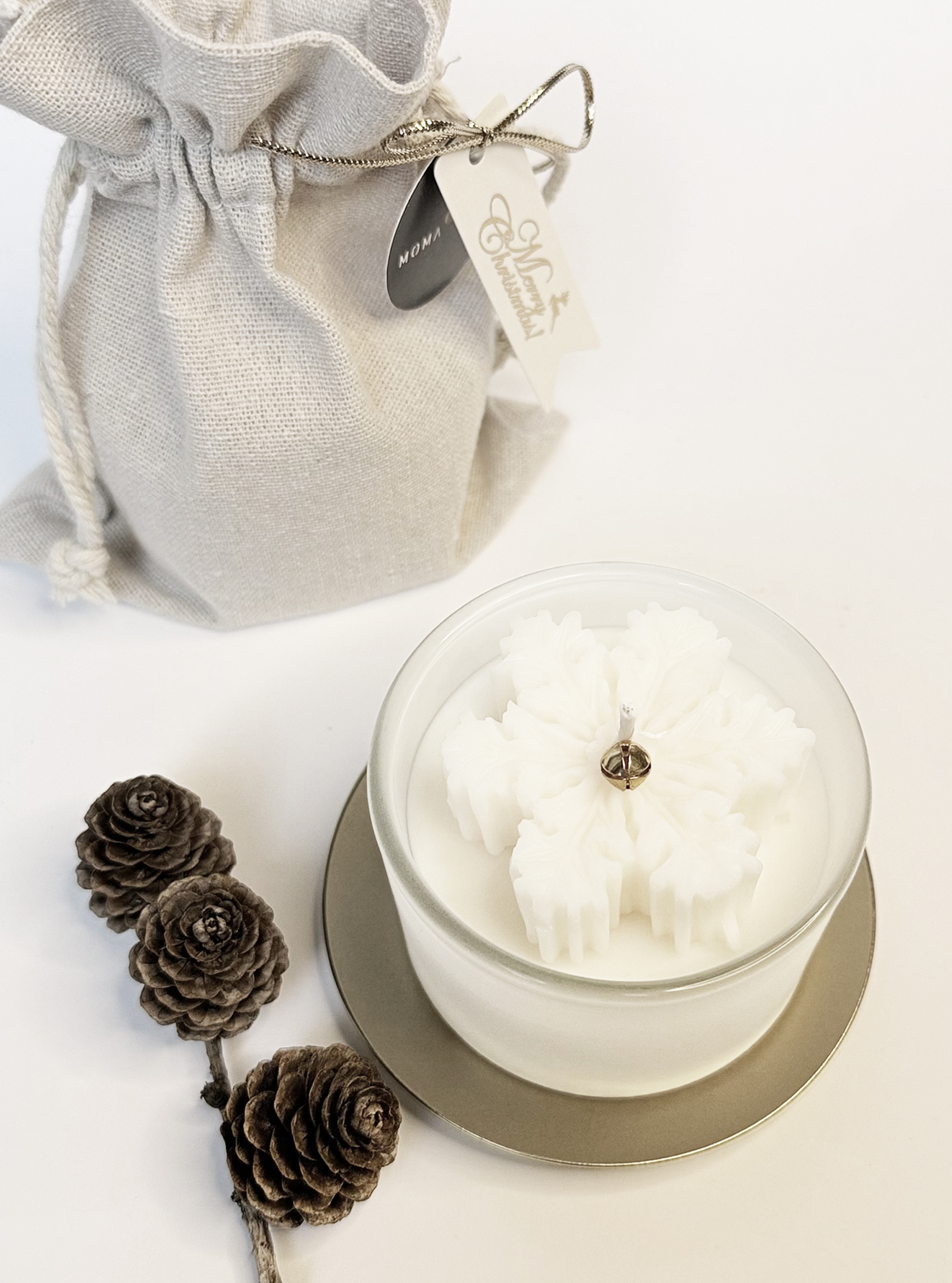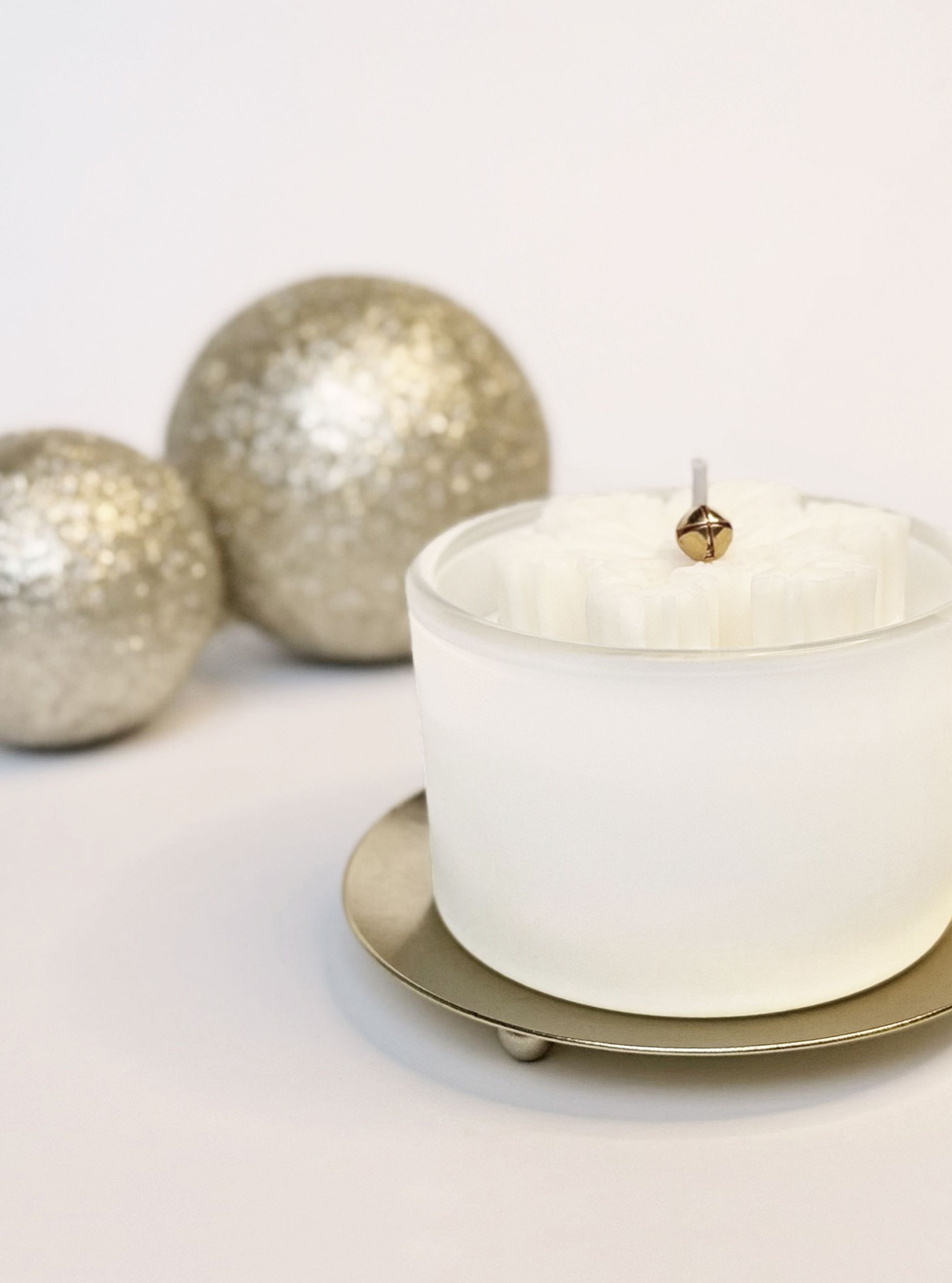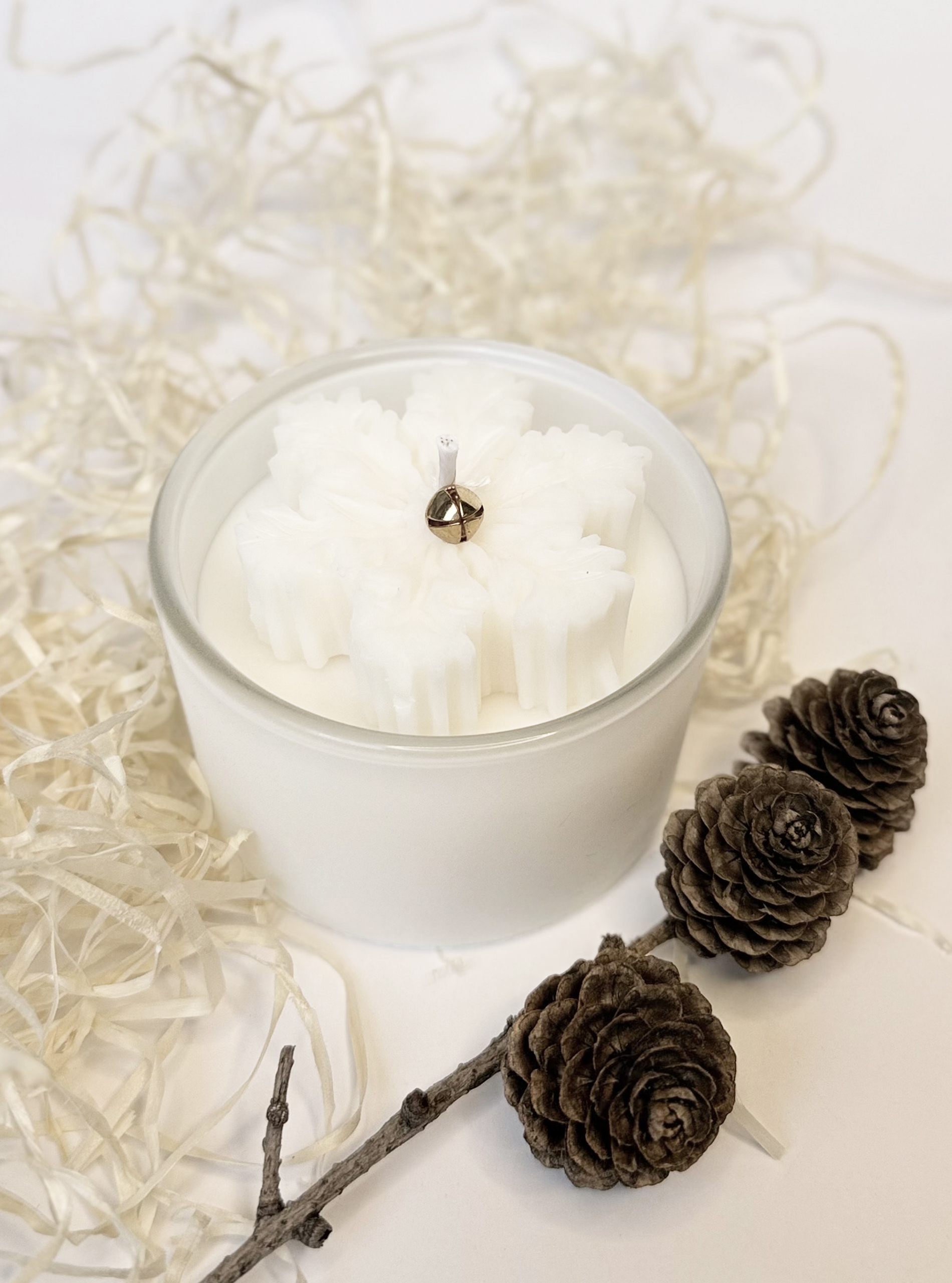 Świeca w szklanej czarce z płatkiem śniegu na górze, wykonana ręcznie ze szlachetnego wosku kokosowego oraz naturalnego bawełnianego knota. Zapach „Białe Święta”, w którym przewodzą świeże, delikatne nuty cytrusów, zwieńczone elegancją kaszmiru i ocieplone nutą wanilii, przywołuje obraz zaśnieżonego lasu, miękkie zaspy śniegu oraz migoczące kryształki lecące z nieba.