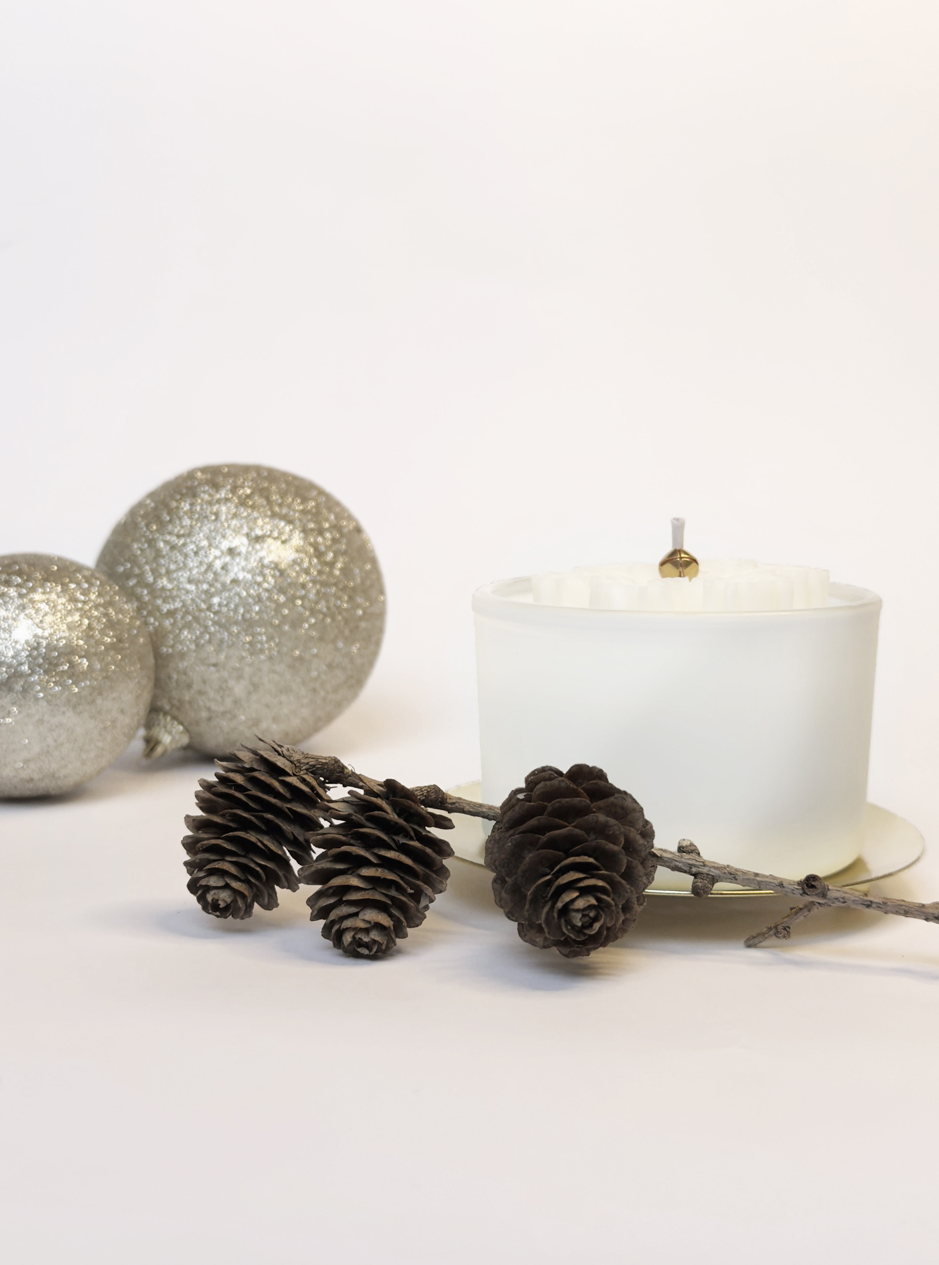 Świąteczna świeca z wosku kokosowego, z naturalnym knotem z niebielonej bawełny, z odrobiną starannie wyselekcjonowanych olejków zapachowych, zgodnych z certyfikatem IFRA – stworzona tak, by było pięknie i bezpiecznie.